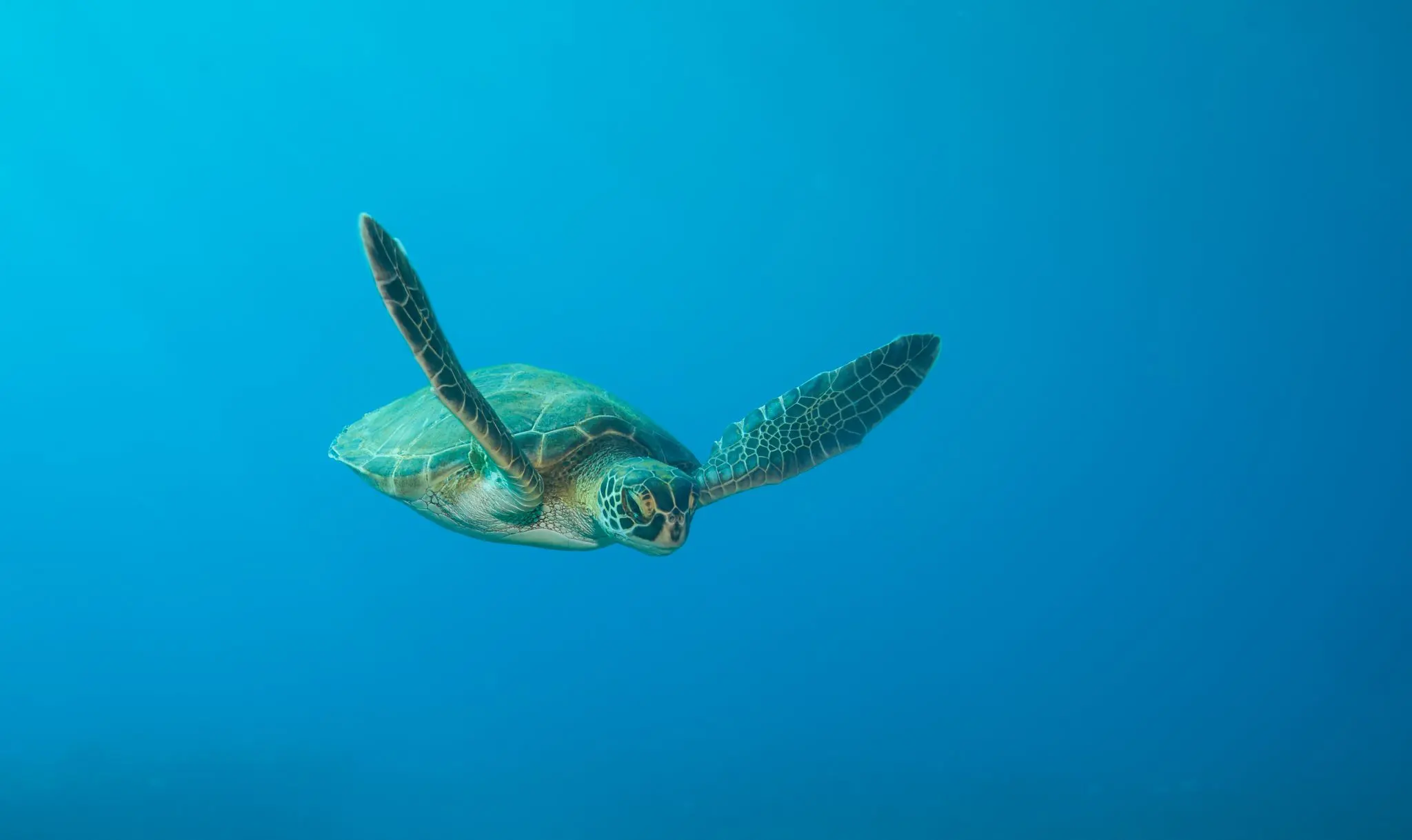 The Green Sea Turtle is distinct from other marine turtle species because it has a single pair of scales in front of the eyes, as well as a serrated bottom jaw. It has an oval shell (carapace), which varies in colour from olive to black, with swirls and irregular patterns. The undershell (plastron) is pale yellow or orange in colour.