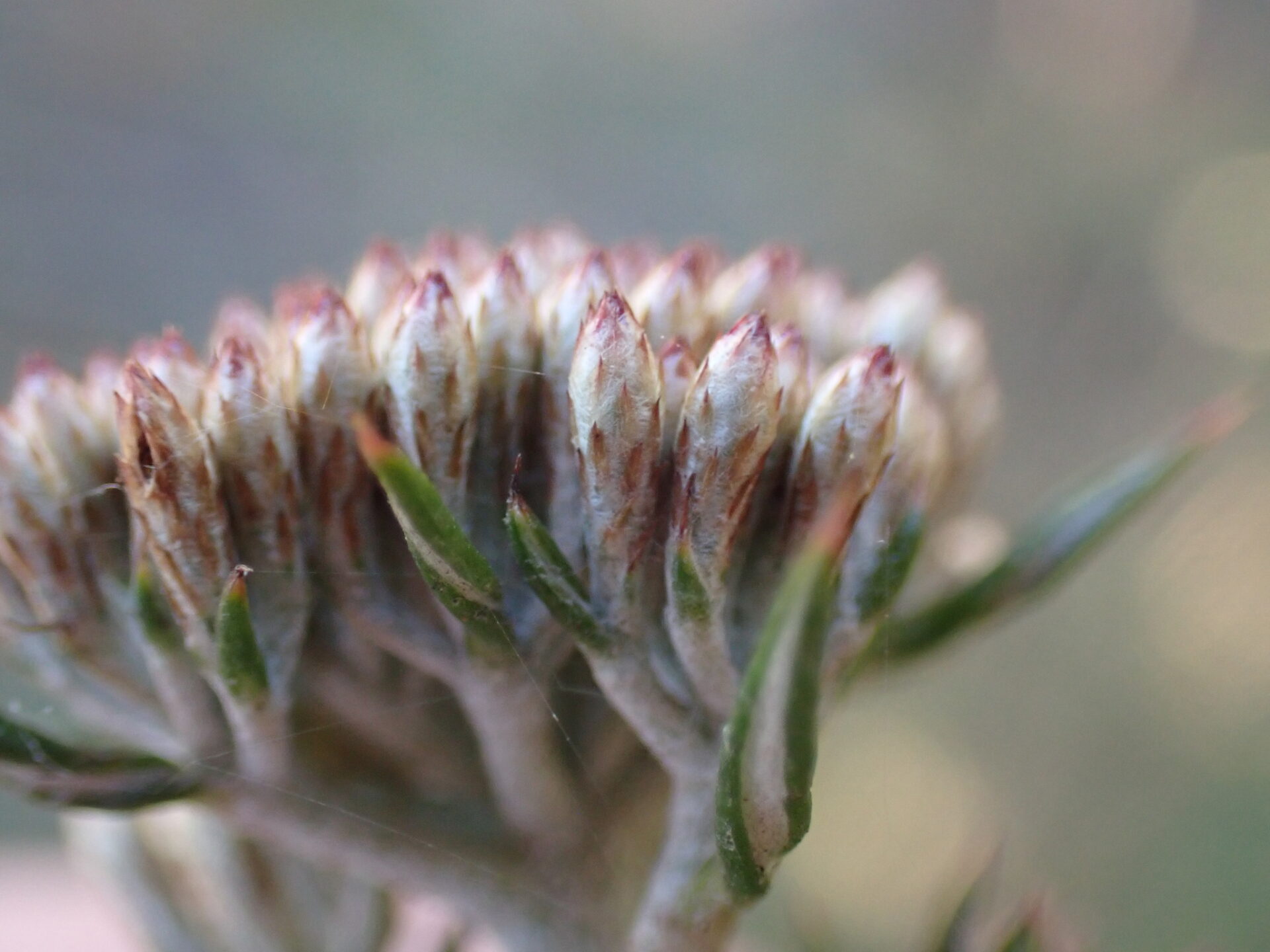 In the whole patch, only two species were still flowering: Crassula tetragona with its succulent leaves and tiny white clusters of flowerheads, and Metalasia acuta— an unassuming, spiky, grey-green shrub of the daisy family. Image: Metalasia acuta. Credit: Adriaan Grobler, iNaturalist, (CC)